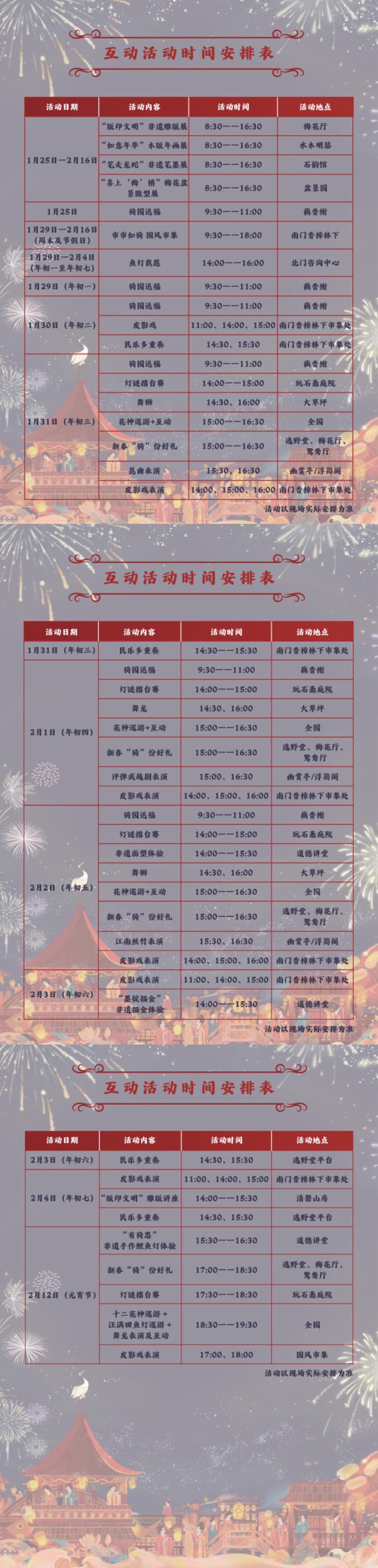 | 本文转自:澎湃新闻  古猗园“十二花神” 本文图片均为 古猗园 图 2025年乙巳蛇年新春,上海古猗园——始建于明代的古典园林,将围绕特色“十二花神”IP,以“花韵夜宴 猗音袅袅”为主题,为游客打造沉浸式非遗体验,让传统佳节绽放别样魅力。系列迎春活动将于1月25日开启。  古猗园布景 踏入古猗园,仿佛步入一场盛大的“花韵夜宴”。南大门入口及照壁处,“十二花神”各怀绝技,或轻抚丝弦、或吟诗弄月、或翩然起舞,手持花韵法器踏出古韵节奏,演绎十二花韵。园内更以中国传统音律“宫、商、角、徵、羽”串联起五大区域,非遗灯彩、灵动花鸟与新年喜乐氛围相融。 年初三至年初五,以及元宵节,古猗园将举办丰富活动。玩石斋里有灯谜擂台赛;大草坪上演舞龙舞狮,“花神们”将与龙狮队引领游客穿梭园林;老园区域,亭台楼阁间可听戏曲;国风市集汇聚非遗好物,并上演皮影戏;全园花灯将在夜幕降临后点亮。  古猗园灯组 写福字、贴春联是春节不变的温馨记忆。在藕香榭长廊,书法爱好者将现场挥毫,以十二花神与生肖蛇为灵感,书写祝福满满的春联、福字。梅花碑廊、曲香廊设有灯谜展示,带来古猗园与上海职工灯谜协会合作打造的谜题。  “如意年华”木版年画展 新春之际,古猗园还将变身非遗文化展馆。鸳鸯厅内,古猗园携手上海历史博物馆带来“如意年华”木版年画展,呈现老城隍庙小校场木版年画,展开一幅旧时社会风貌图;梅花厅中,“版印文明”非遗雕版展呈现古代雕版工具与精美印品;逸野堂的“笔走龙蛇”非遗笔墨展展现文房四宝的魅力;盆景园里,梅盆景展将彰显园艺的精妙。 喜庆迎春,古猗园为游客准备了多重福利。年初一至年初七,每日10点起,凭全价门票可在南门游客咨询中心领取限量窗花,为新春添一抹传统红;年初三至年初五和元宵节,完成园内互动体验就能抽取新春好礼。亲子家庭可报名参与非遗美育课程体验猗园特色非遗面塑,以“暗八仙”为主题雕琢指尖非遗,或制作一盏鲤鱼灯,提灯夜游。  古猗园舞狮 资料图 值得一提的是,正月初一和元宵节当日,身着带有“花”纹样中式传统服饰的游客可免票入园。2月5日-2月16日,游客在上海古猗园小笼餐厅消费,可凭当天全价门票票根免费兑换汤品或抵扣消费金额,具体规则可现场咨询。  古猗园互动活动时间安排表